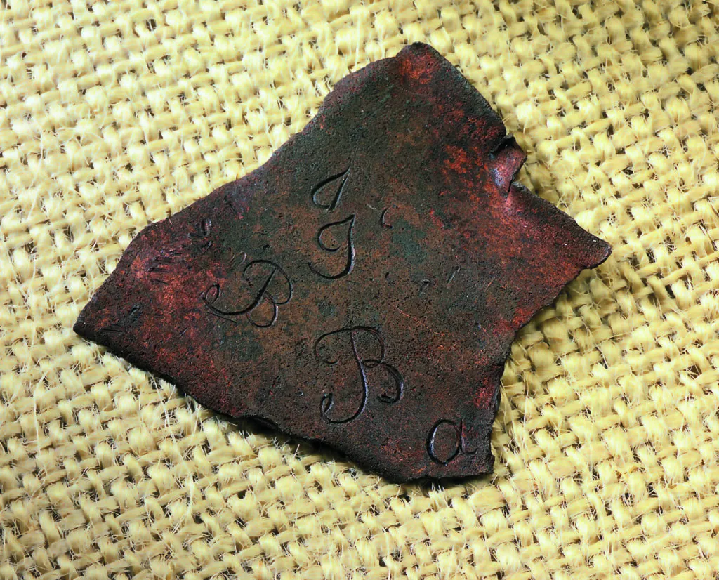 At least one person at Michilimackinac did metal engraving for decoration and personalization. In addition to the letters you can see on this practice scrap, there are a “G” and an “a” on the reverse side.