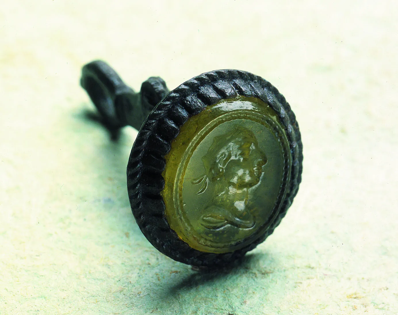This letter seal may have been discarded because the glass intaglio is cracked. This seal pivots in its holder, unlike the fixed seal shown previously.
