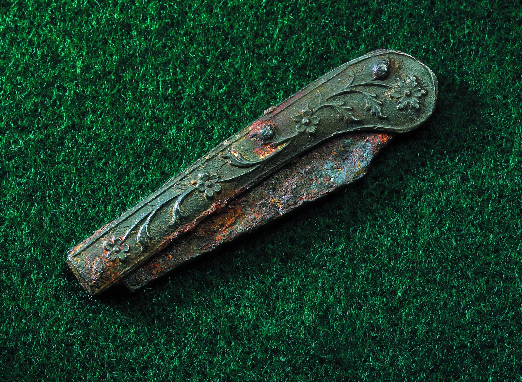 Penknives, originally used to sharpen quill pens, suggest a literate owner. In addition to the fancy floral design, tiny traces of red and gold paint are visible on the handle
