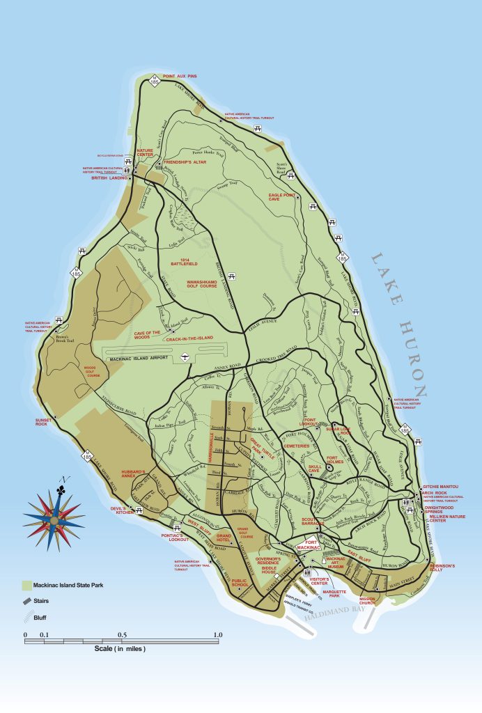 Mackinac Island State Park contains 70.5 miles of signed and interpreted roads and trails. Some are paved, some are not. Some are shared by horses, bikes and walkers; others are best for hiking only. There are also over 50 interpretive panels throughout the park that describe the natural wonders and historic locations, as well as five interpreted trails, including the Native American Cultural History Trail and Mackinac Island Botanical Trail. Click here to learn more.