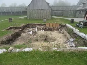 The end of May brings rain, flowers, insects, and archaeology. While next year will be the 60th anniversary of archaeology at Michilimackinac, this year is the 60th season. We will be back for our eleventh season of excavation at House E of the Southeast Rowhouse. Over the past eleven summers we have excavated the south wall, a root cellar, and chimney collapse, and found thousands of artifacts used by the fur traders who lived here. Highlights can be seen in previous blog posts, and include many types of ceramics, personal adornment items such as cufflinks, buttons and rings, an intact rosary, an intact pocket knife, and two shutter hinges. This summer we plan to excavate deeper in the cellar and expose more of the interior wall exposed last summer.