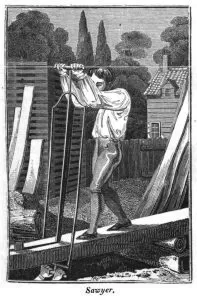 To fashion planks and boards, a squared timber is either placed over an open sawpit dug into the ground or hoisted overhead on large sawhorses. To cut boards, a pit sawyer climbs into the hole to pull down on a large saw, while a top sawyer balances above, pulling up on the blade and guiding a straight cut. Despite the unforgiving rocky terrain, several saw pits were dug on Mackinac Island during the construction of Fort Mackinac.