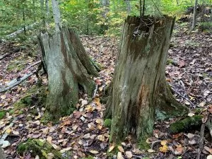 When the sawmill at Dousman’s Mill was abandoned, large trees throughout the Straits region had been harvested for nearly 150 years. As young trees grew in their place, they too were eventually cut in subsequent periods of logging. In 1860, William Johnston wrote, “the trees now seen [on Mackinac Island] are the second and third growth.” In a History of Northern Michigan and its People (1912), author Perry Powers detailed extreme clearcutting from the 1860s–1900s in an aptly named section, “Melting of the Pine Forests.” After pine was cut, hardwood harvest followed, with old growth maples and oaks falling under axe and saw. Commercial logging operations took place at the Dousman’s Mill site through 1923, with the Cadillac Veneer Co. running a portable sawmill to process hardwood logs, pulpwood, cedar, and stove wood.