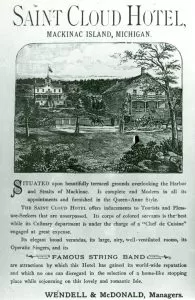 Josiah E. Wendell and James A. McDonald. The former was the son of Abraham Wendell, an early customs official on the island and namesake of the still extant 1840s Wendell house further down Main Street. Little is known of James McDonald, save for that he was a carpenter and married Catharine Earley, member of a prominent pioneer Mackinac family. As Wendell and McDonald are always listed as either managers or proprietors, it is clear that they were not the owners. Prominent ads for the hotel, and even its listing in the Michigan Gazetteer, disappear after 1883. It is likely the owner of St. Cloud ceased using managers around this time.
