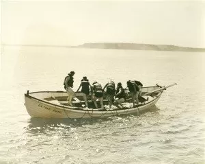 The primary duty of the crew was to provide assistance to vessels in distress, and perform rescue operations if needed. The crew drilled regularly, launching the lifeboats directly from the boathouse into the harbor. They also practiced with the beach cart and Lyle gun, a small cannon which could fire a rope out to a stranded ship. With the rope in place, the crew could remove passengers from the stricken vessel using a suspended bosun’s chair. Since the Mackinac Island station was located downtown, drills were highly visible, and became a popular attraction for island visitors.