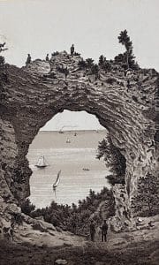 The eastern part of Mackinac merits attention. First in order we have the beautiful Arched Rock. This is 150 feet above Lake Huron, and is an almost perfect arch, with a span of 90 feet. The visitor can reach the summit by a little careful climbing, and sitting on the top of the arch, which is but three feet wide, he has a glorious view of the waters, ships, Bois Blanc Island and the mainland.