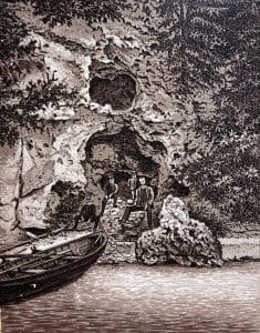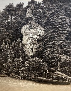 The Giant’s Causeway, a short distance south, is another massive rock that was hurled up from beneath the waters by some convulsion of nature in the days when the world was young. It does resemble a massive stairway leading up from the water to the cliff. Robinson’s Folly, an overhanging rock near the Causeway, was the scene of one Capt. Robinson’s folly, as he erected a house and an arbor on the very brink of the precipice, which becoming effected by the wind and storms, broke off, carrying the arbor with it, nearly 200 feet below. The Sugar Loaf is a pile of limestone rock shaped very much like the traditional sugar-loaf. A few straggling cedars are seen upon it … A grotto in the side of the rock will shelter four persons. The Indian legend says the Manitou, or Great Spirit, emptied the ashes of the peace-pipe here thus forming the rock.