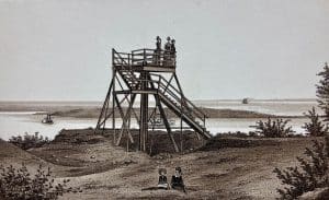 Of the natural scenery, first in order we have the Lover’s Leap, a rock rising from the beach, out from the bluff, about 175 feet high. A very romantic Indian story is connected with this place, and this fact and its grandeur as it stands boldly out like a sentinel guarding the rocky shore, makes it one of the favorites. A short distance west the wonderful Chimney Rock is reached. This is a solid pile [of] brecciated limestone about 110 feet high, shaped somewhat like a chimney as seen from the lake. Prof. Winchell considers it the most interesting rock on the island, and when we study its geological history this appears a well founded opinion.