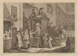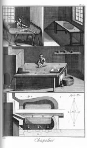 The resulting product was called a “batt” in English, and “capades” in French. The batts were covered with damp cloth or leather and placed on top of each other over a small heat source. The heat and moisture encouraged further bonding, condensing, and shrinking of the batts. The moist batts were layered on top of one another while receiving more heat and moisture to continue the bonding process, and finally rolled out to form a dense felt fabric. Hatters placed the felt blanks onto wooden forms to create the shape of the crown as well as some of the brim. On the form the hat would be shaped, trimmed, ironed into the final product. Beads, ribbons or feathers could all be added to a finished hat once it went on sale in shops around Europe or North America.