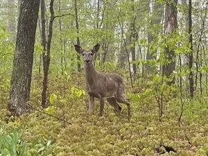 About 30% smaller than white-tailed deer, European fallow deer retain white spots as adults. Much variation occurs in coat color of the species, with all black and all white variants. Only bucks grow antlers, which become broad and palmate when they reach 3 years of age. To date, no photos are known of fallow deer on Mackinac Island.