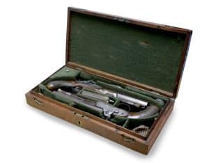 Made sometime between 1802 and 1824, it is likely that these pistols arrived on Mackinac Island with Colonel Whistler when he served at Fort Mackinac in 1833. As commandant, Colonel Whistler and his family would have lived in one of the officers’ quarters within the fort walls.