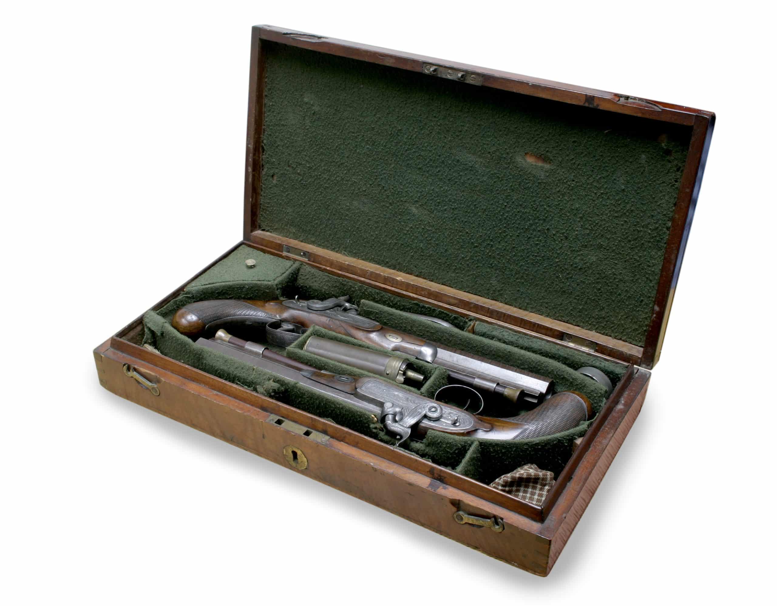 The pistols were stored in an elegant wooden case with brass hinges and rich, green fabric, helping to highlight their lavishness. Inside the case, several other items were found which were used for maintenance on the pistols. This included cloth swabs for cleaning and a bottle of oil to protect and preserve the pistols, as well as a small cleaning brush made of mahogany and ivory. In addition, the case held a brass powder flask, a canister for pistol caps, and a steel mold for bullets. All together, these additional items show the immense amount of work and care necessary to maintain these fashionable pistols – highlighting their role as status symbols and luxury items.