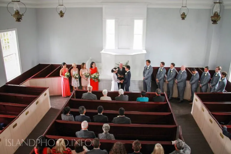 The church can accommodate up to 160 guests. The wedding party has access to the front room of the lower level, including a restroom, to prepare for the wedding. A Mackinac State Historic Parks representative will be available throughout the ceremony.