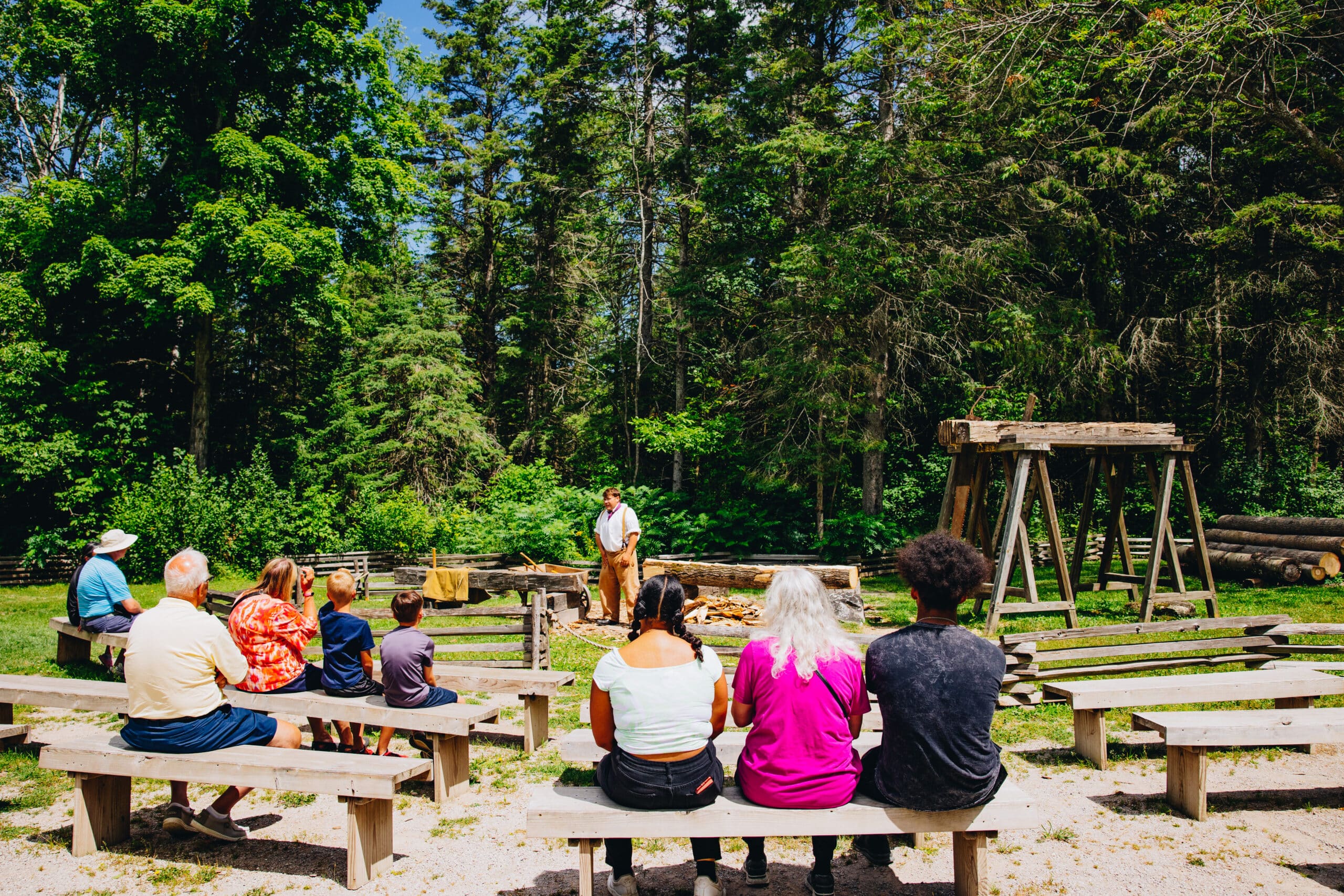 Watch as axes are used to turn logs into timbers and help a Sawyer make sawdust fly with a pit saw. Meet at the Sawpit. This experience included with regular